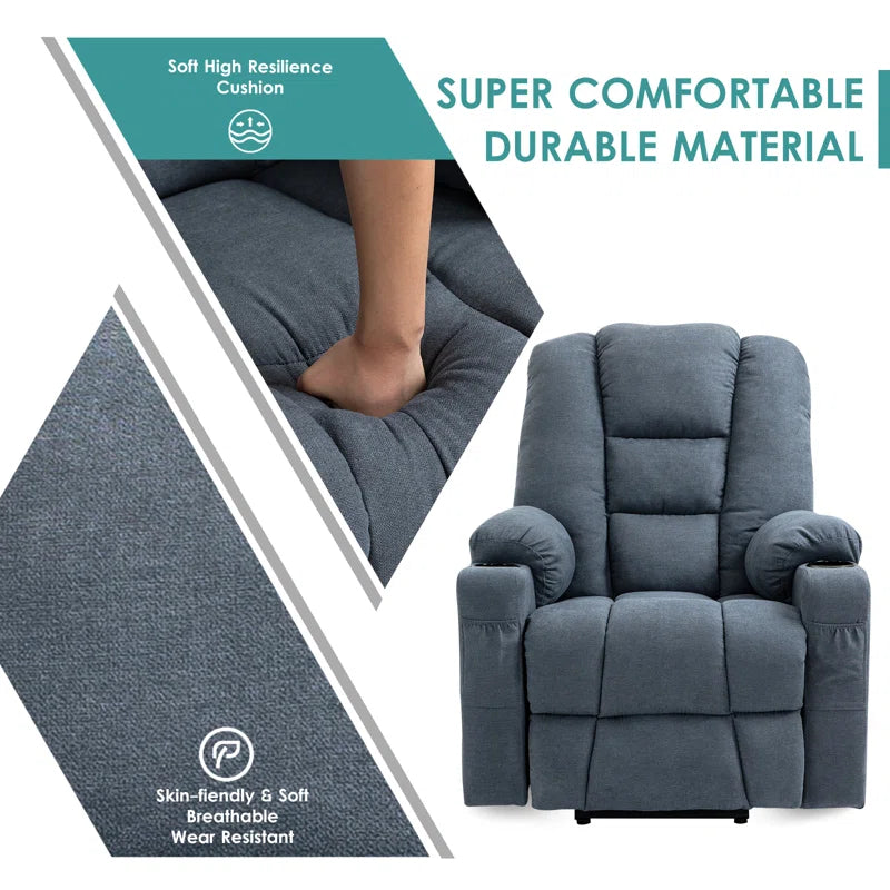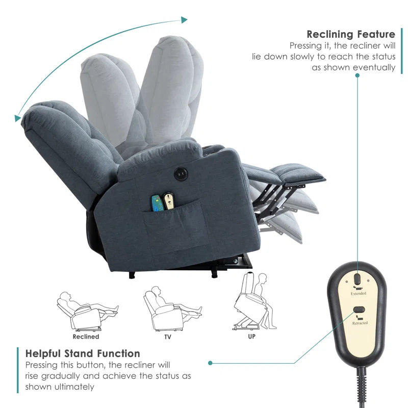 Are you still worried about not finding a suitable recliner sofa to relieve your rigid muscles while resting? Just try this power lift recliner to lift or recline easily. The lift recliner chair for the elderly has a wide cushion and soft fabric. 8 vibration points, covering the back, waist, thighs, and legs, eliminating fatigue caused by daily work, and lumbar heating is conducive to blood circulation. It has a USB port on the right side and 2 side & front pockets for storing mobile phones or magazines.